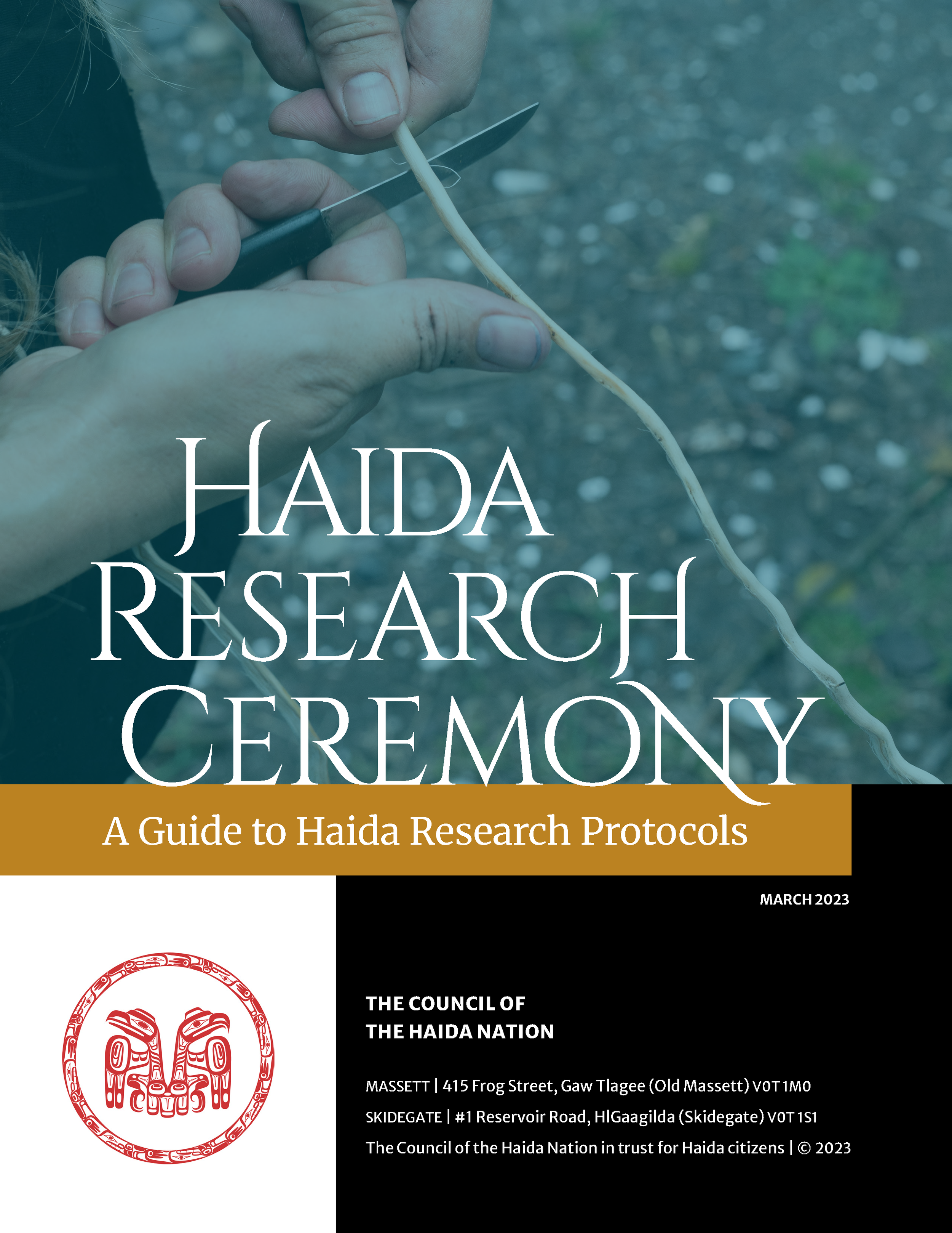 Haida Research Ceremony: A Guide to Haida Research Protocols – This was a First Peoples’ Cultural Council Braided Knowledge funded project to document research protocols that reflect Haida values, processes, and traditions and the “right ways” to do Haida research with respect. We were invited to attend an already planned (and self-funded) trip to gather Kayd hll.nga | hlíing (spruce roots) with three generations of master weavers: Ilskyalas Delores Churchill, Xiihliikingang April Churchill, and Jaad Tl’aaw Paula Varnell to Diinal Gandlaay (Gray Bay), Haida Gwaii in 2022. This report has been approved by the Advisory Council to release for public input.