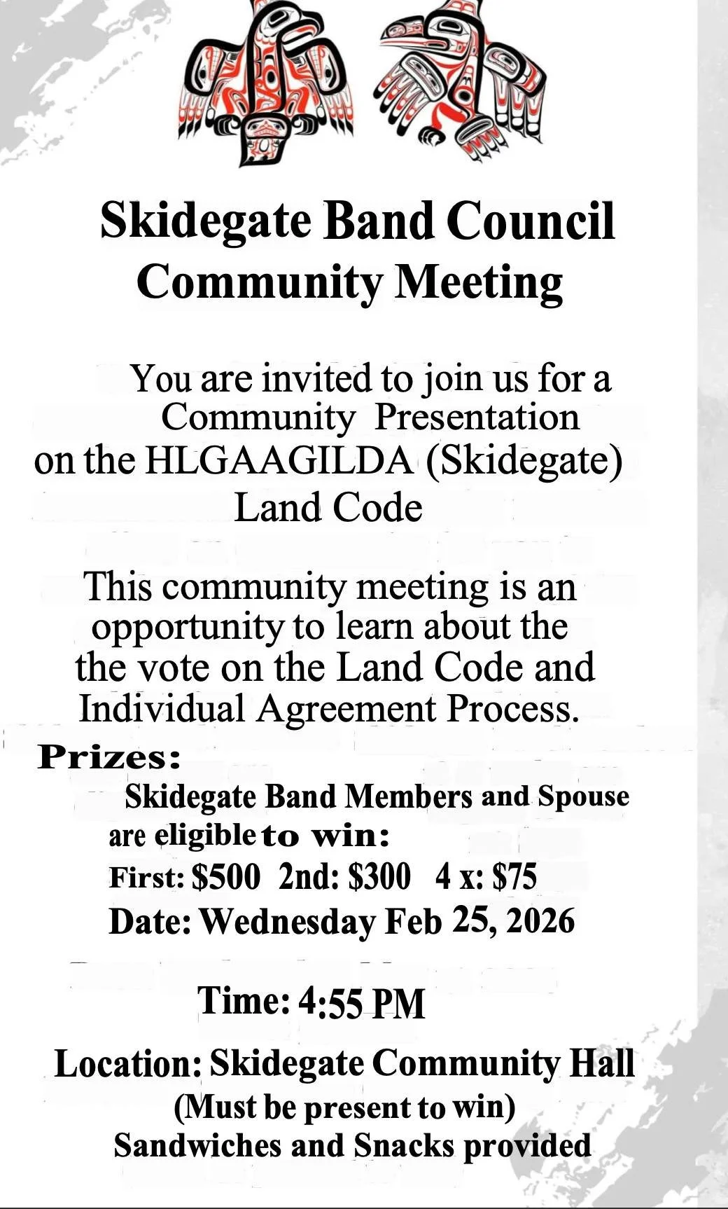 This community meeting is to learn about the vote on the land code and Individual Agreement Process.