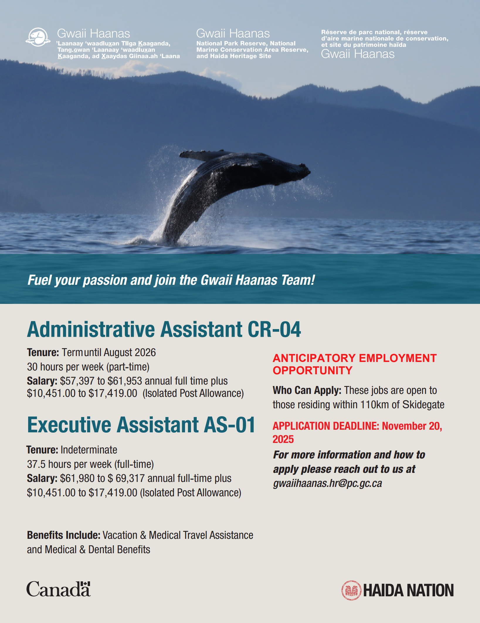 APPLICATION DEADLINE: November 20, 2025 For more information and how to apply please reach out to us at gwaiihaanas.hr@pc.gc.ca