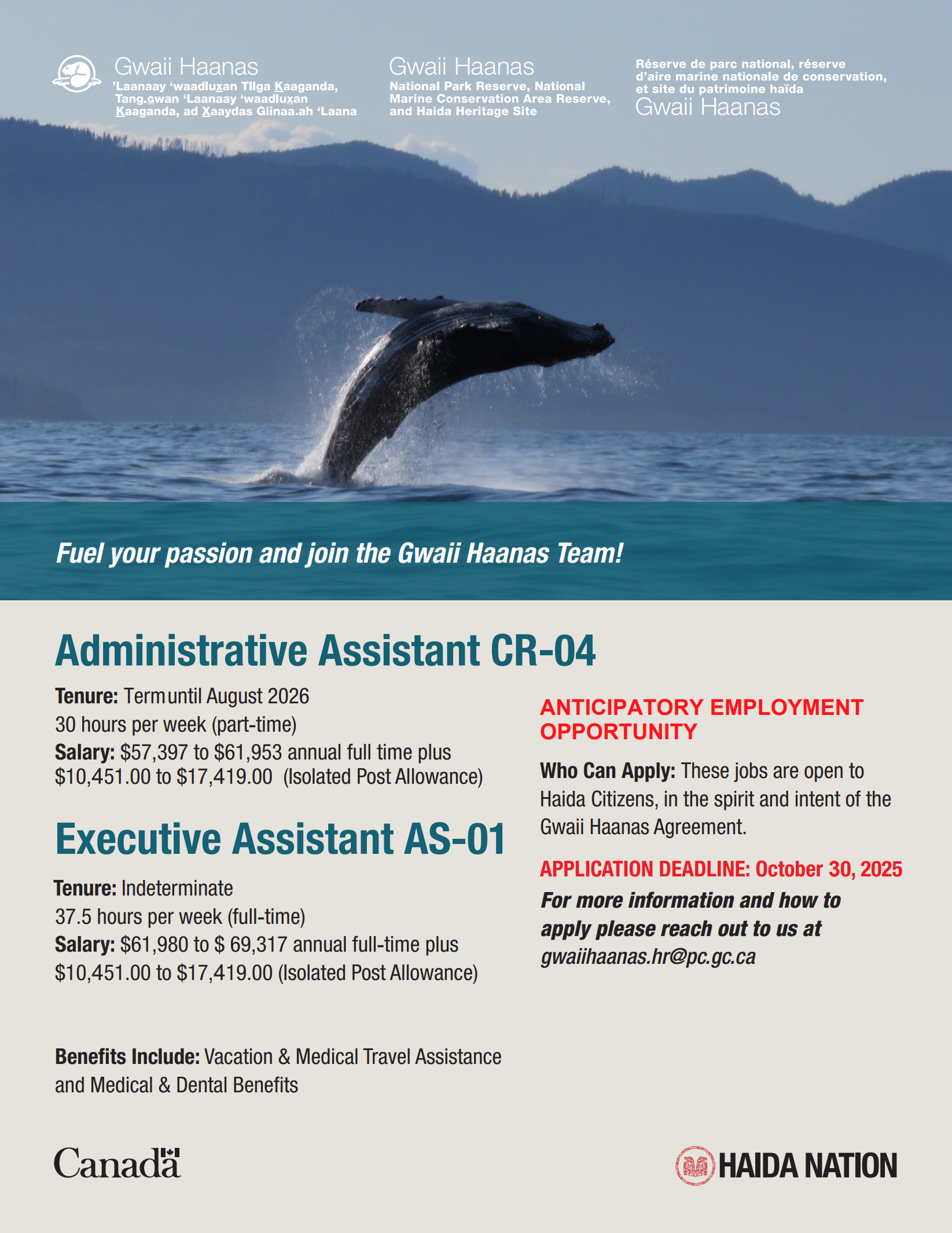 APPLICATION DEADLINE: October 30, 2025 For more information and how to apply please reach out to us at gwaiihaanas.hr@pc.gc.ca