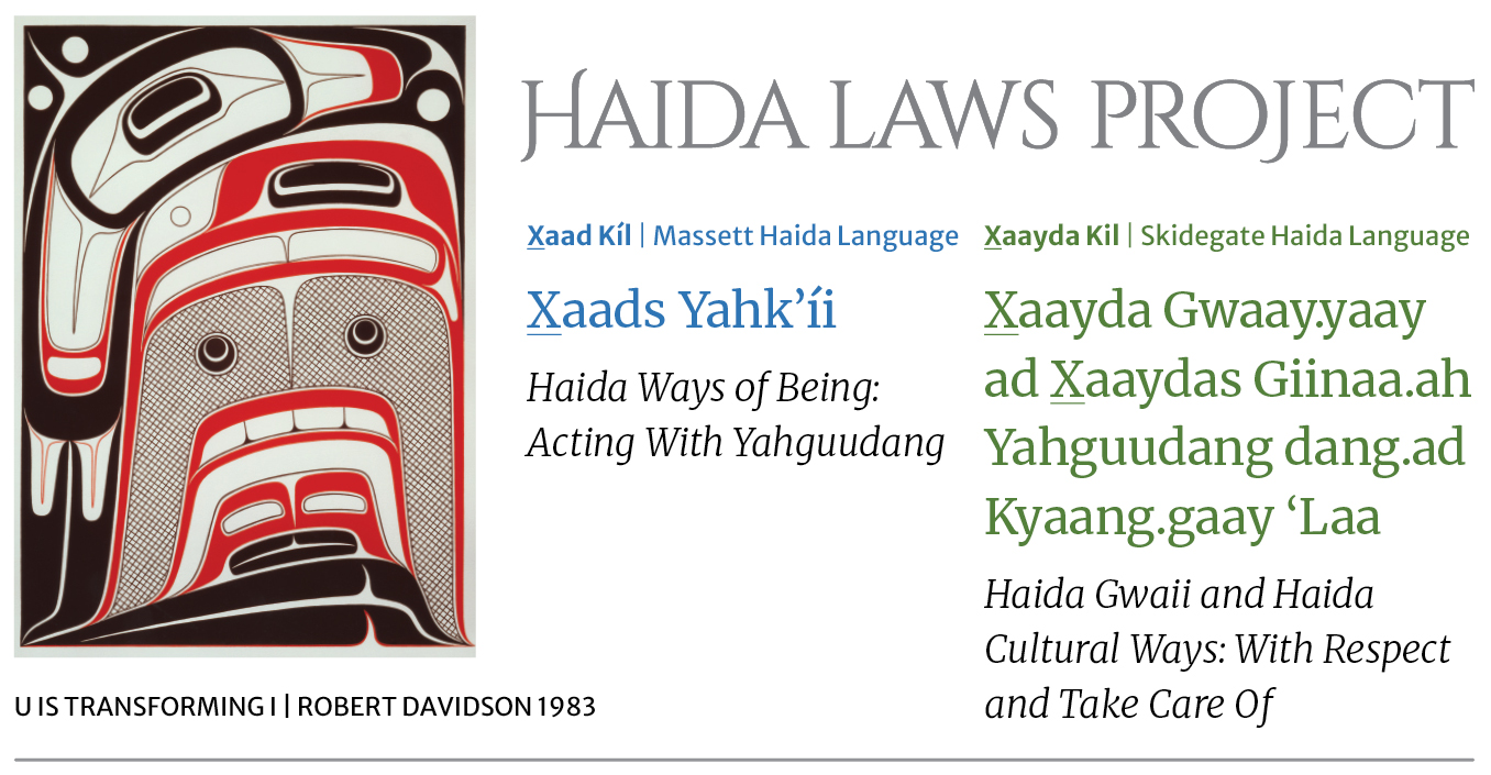 The Haida word for law, kil ‘yahda, means ‘saying it right, or with truth’. Haida law arises directly from Haida Gwaii and its Supernatural Beings and is intimately connected with the land and waters of Haida Gwaii. To engage in Haida ways of being, Haida citizens will join Elders and knowledge-holders in discussions about Haida protocols, values, stories, language, and culture on the lands and waters of Haida Gwaii, revitalizing and engaging Haida law. This project is unique in that it honours and make visible the Haida legal tradition and the Haida Supernatural worldview, and it employs methodologies rooted in Haida Gwaii.