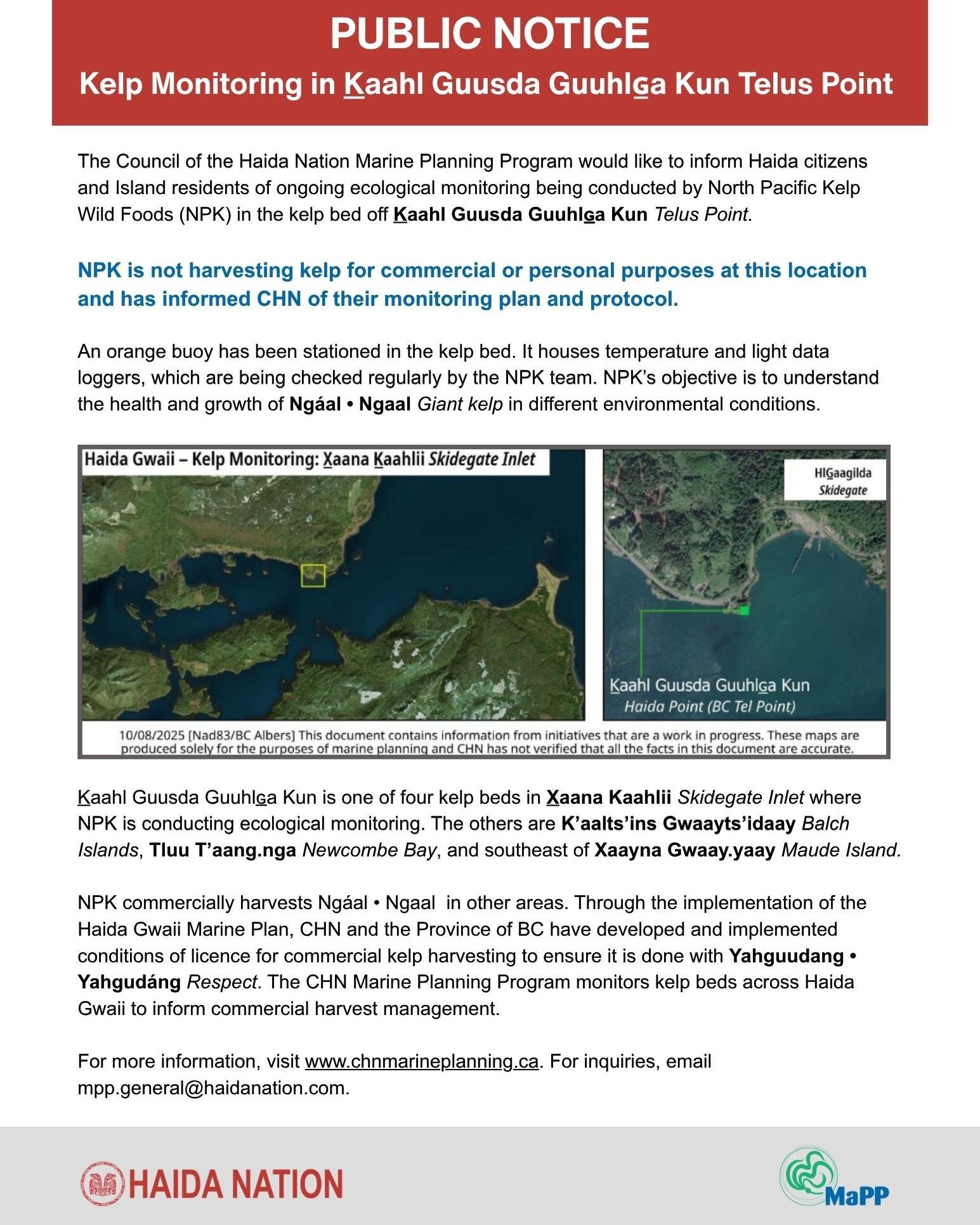 The Council of the Haida Nation Marine Planning Program would like to inform Haida citizens and Island residents of ongoing ecological monitoring being conducted by North Pacific Kelp Wild Foods (NPK) in the kelp bed off Ḵaahl Guusda Guuhlɢ̲a Kun Telus Point.